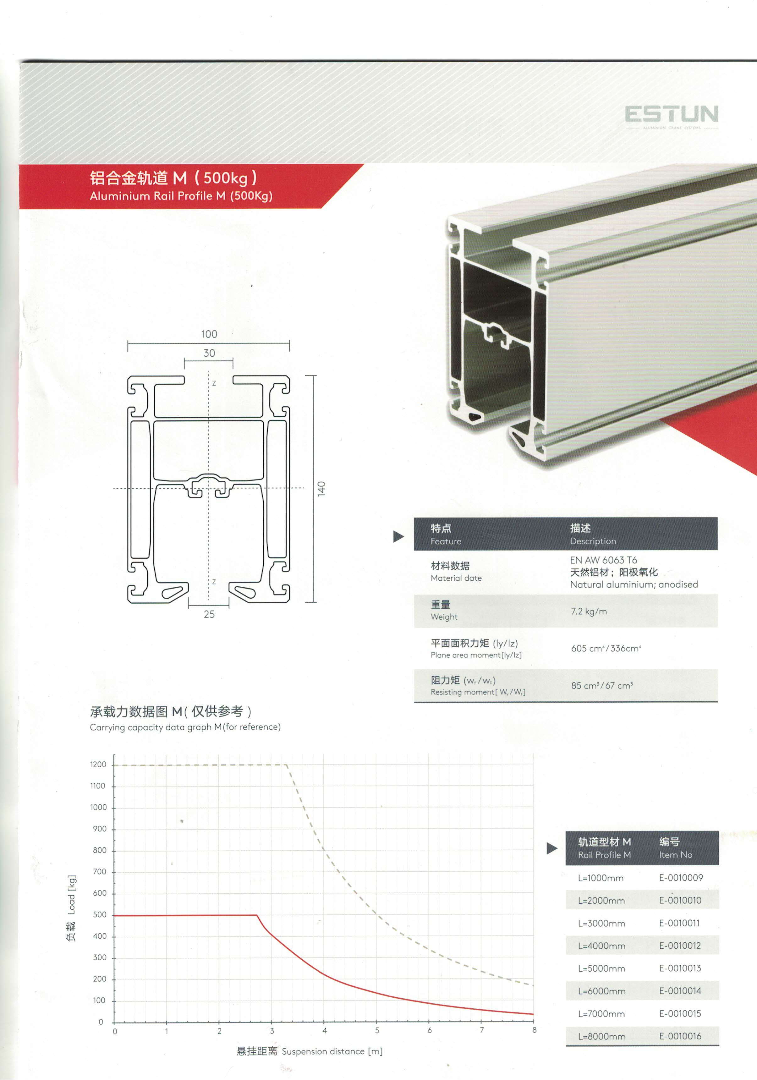 M型鋁合金軌道外形尺寸是140*100mm,每米重量7.2KG,在3米跨度之內(nèi)載重500KG,超過3米跨度,載重量會隨著跨度的變化而變化,在設(shè)計載重量的時候請咨詢重霸起重專業(yè)人員。
